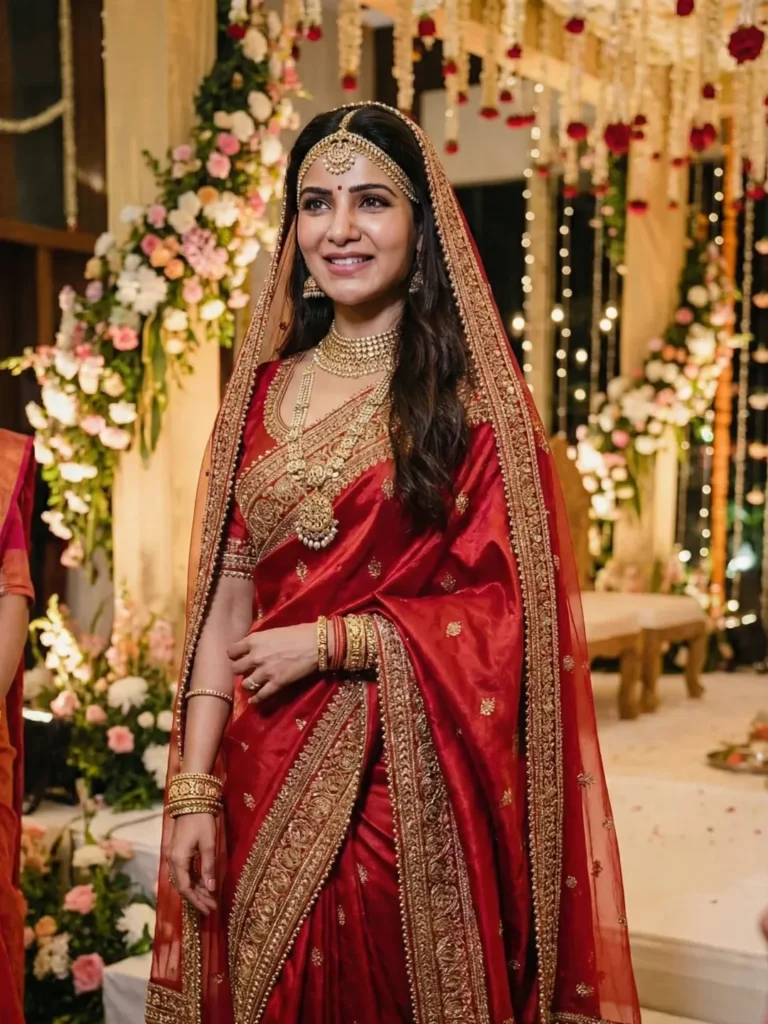 As mentioned above, Samantha believes in a strong spiritual belief, so she celebrated her wedding in full Indian attire. She wore a red Banarasi cotton silk saree with a white border, which was quite nice and a perfect contrast to the usual. She also wore traditional jewelry with the saree, but the wooden crafts on her hands also looked quite nice. Her hairstyle was also very formal, as we can see in the waiting photo, and she looks very happy and joyful at the wedding.